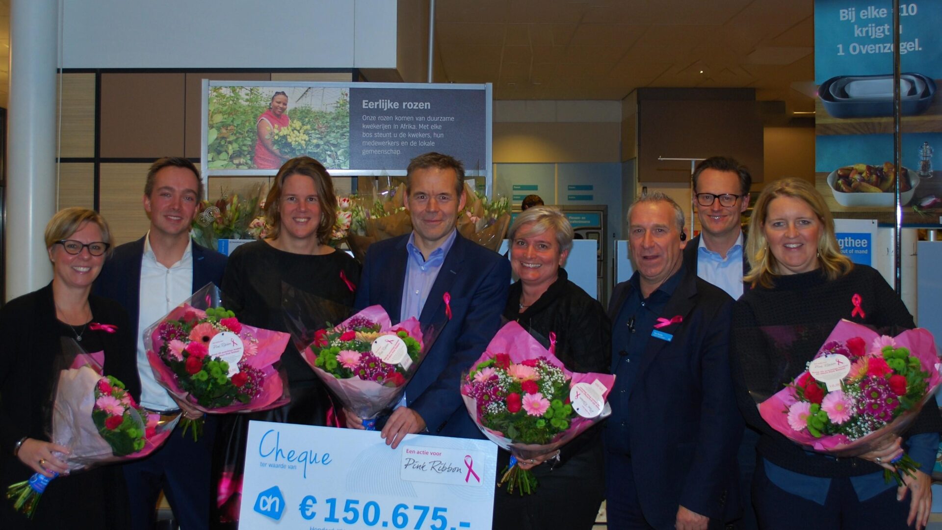 Tijdens de borstkankermaand werden speciale boeketten voor Pink Ribbon verkocht door Albert Heijn, in samenwerking met Bloom. Per verkocht boeket werd er € 2,50 gedoneerd aan borstkankeronderzoek. Gisteren is de opbrengst van de actie bekend gemaakt. Marit van Egmond, Commercieel Directeur Albert Heijn, overhandigde een cheque van ruim anderhalve ton aan Jan Willem Forch, manager Werving Pink Ribbon. Wij zijn trots dat er zo’n mooi bedrag is opgehaald!
